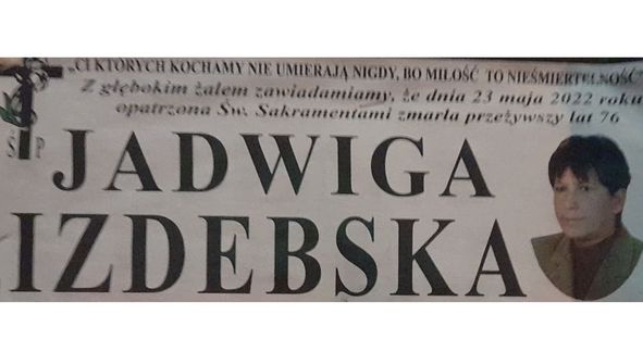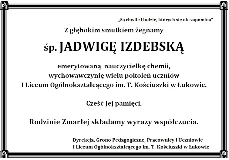 23 maja w wieku 76 lat zmarła Jadwiga Izdebska, emerytowana nauczycielka z I LO im. Tadeusza Kościuszki w Łukowie. Ceniona chemiczka, wychowawczyni kilku pokoleń, wymagająca, ale też potrafiąca w przystępny sposób przekazać zawiłości przedmiotu, którego uczyła.