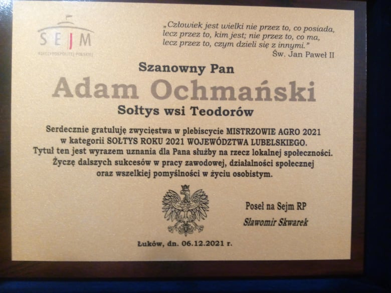 Adam Ochmański to sołtys Teodorowa w powiecie łukowskim. W Plebiscycie Mistrzowie Agro 2021 zdobył tytuł Sołtysa Roku 2021 Województwa Lubelskiego. 27 listopada pan Adam, który jest też prezesem Koła Przyjaciół KRP w Wandowie, odebrał nagrodę podczas gali w ramach Centralnych Targów Rolniczych w Nadarzynie k. Warszawy.