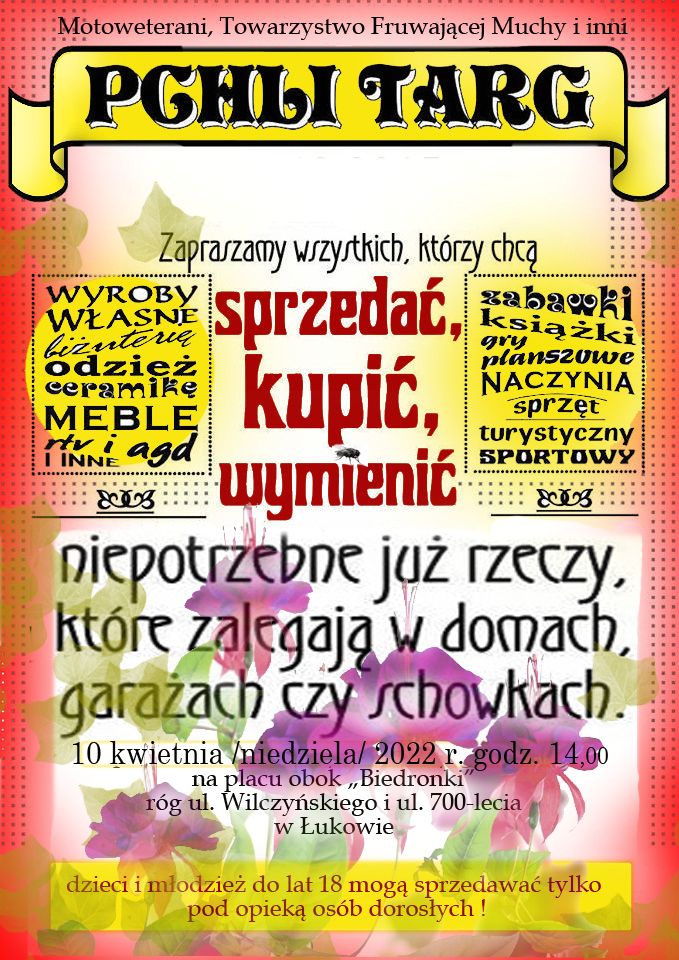 Towarzystwo Fruwającej Muchy i Motoweterani organizują kolejny Pchli Targ w Łukowie. To wydarzenie dla każdego, kto chce coś sprzedać, kupić lub wymienić. Pchli Targ odbędzie się w niedzielę 10 kwietnia.