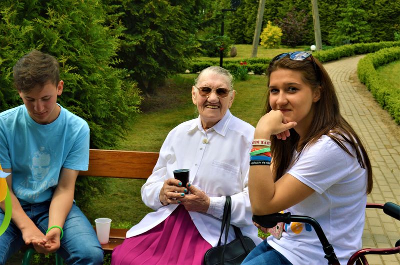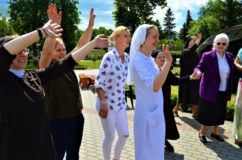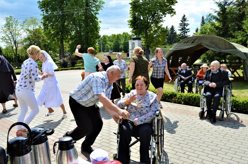Po skończonej ofierze Mszy Świętej, w Sanktuarium Najświętszej Maryi Panny Patronki Żołnierzy Września, oraz odśpiewanej Litanii Loretańskiej młodzież pomogła w przejściu pensjonariuszy „za miedzę” - na plac przy Domu Pomocy Społecznej, gdzie rozpoczęła się dalsza część zaplanowanych, przez Siostry Karmelitanki zabaw, tańców i wspólnych śpiewów. Spotkanie przebiegło w radosnej atmosferze. W trakcie wspólnej zabawy mieszkanki goszczącego Domu zaprezentowały przygotowaną na tę uroczystość pieśń. Całość spotkania uświetnili również bracia Kardas – Jakub, grający na akordeonie oraz Kacper uzdolniony saksofonista.