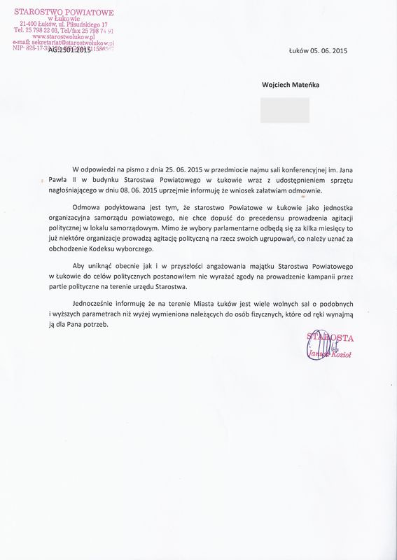 Tymczasem, w piśmie w którym odmówiono wynajęcia sali, podpisanym przez starostę Janusz Kozioła, można przeczytać, że odmowa podyktowana jest tym iż Starostwo Powiatowe jako jednostka organizacyjna samorządu powiatowego, nie chce dopuścić do precedensu prowadzania agitacji politycznej w lokalu samorządowym. Zdaniem starosty choć nie ma jeszcze kampanii wyborczej, to agitacja jest już prowadzona i jest to jego zdaniem obchodzenie Kodeksu Wyborczego.