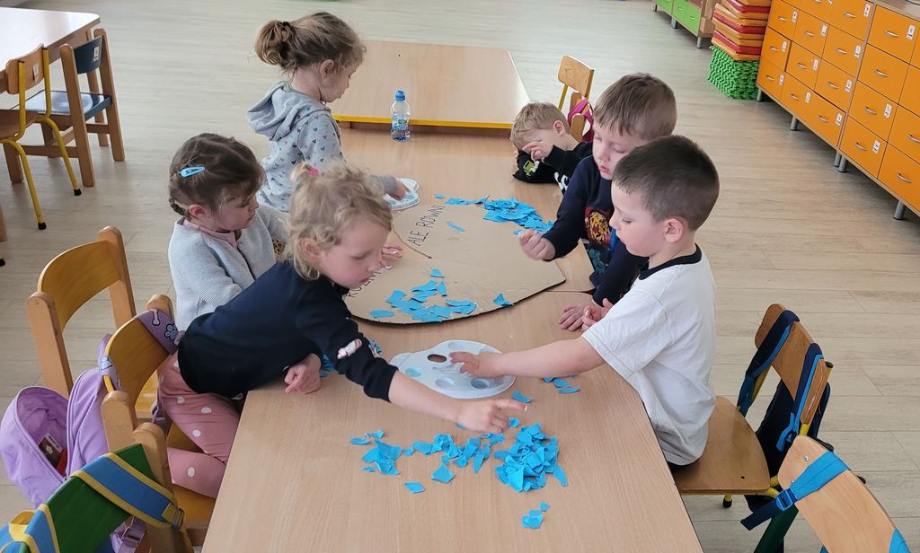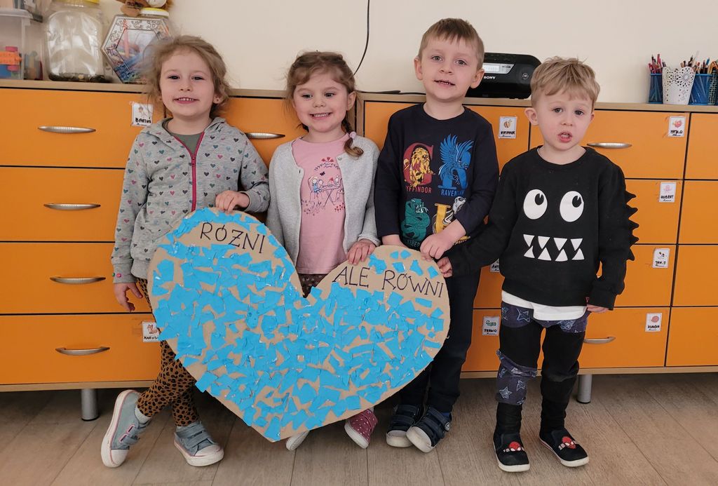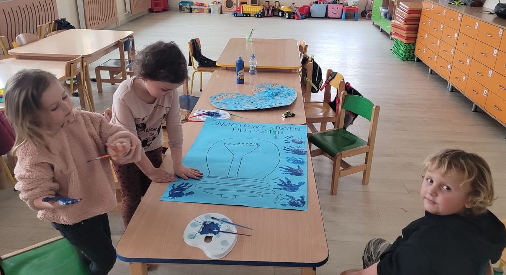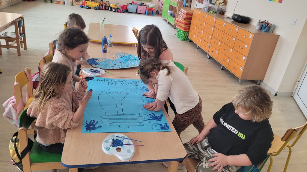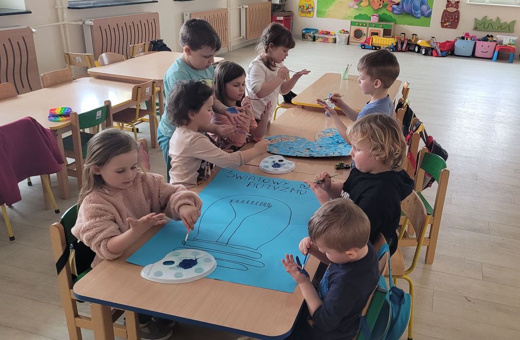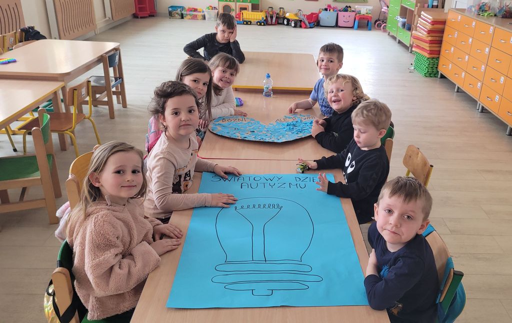 Obchody Światowego Dnia Wiedzy na Temat Autyzmu rozpoczęto już na początku kwietnia. W przedszkolu w akcie solidarności z osobami cierpiącymi na autyzm wszystkie dzieci z grupy świetlicy popołudniowej wraz z nauczycielką Izą Izdebską „zaświeciły” na niebiesko, ponieważ symbolami tego święta są żarówka i związane z nią motto: ,,Cała Polska świeci na niebiesko". Podczas zajęć plastycznych używano tylko niebieskich farb, kredek, papierów. Przedszkolaki wykonały niebieskie dłonie, obejrzały film ,,Maria i ja", który opowiada o Marii, dziewczynce dotkniętej autyzmem. Ostatnim punktem dnia było słuchanie piosenki ,,Wielka siła”.