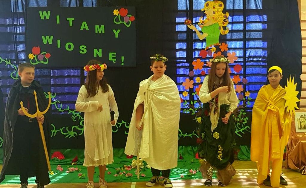 Jak czytamy w nadesłanej do nas relacji, cała uroczystość składała się z dwóch części. Pierwsza część była poświęcona historii teatru. Prowadzące spotkanie uczennice opowiedziały o tym, jak powstawał i rozwijał się teatr na przestrzeni wieków. Następnie klasa IV pod kierunkiem swojej wychowawczyni Edyty Adrian wystawiła sztukę na podstawie mitu „O Demeter i Korze”. W drugiej części wystąpili uczniowie z wszystkich klas. Były wiersze, piosenki, zagadki, krótkie wiosenne rymowanki i przysłowia.
