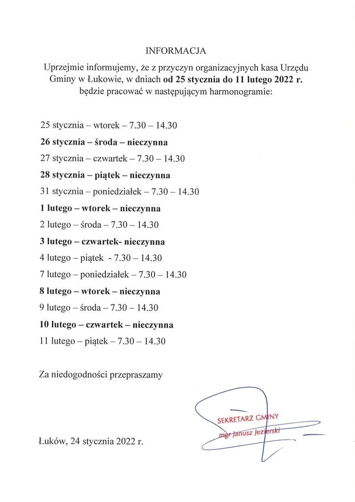 Zgodnie z zapowiedziami Ministra Zdrowia, w administracji publicznej wprowadzono pracę zdalną. 21 stycznia ukazało się w tej sprawie rozporządzenie Rady Ministrów. Na tej podstawie władze gminy Łuków wprowadziły nowe zasady pracy urzędu. Jest on nadal otwarty dla mieszkańców, ale proszeni są oni o ograniczenie wizyt w urzędzie do niezbędnego minimum i zachęcani do kontaktów telefonicznych lub przez internet. Opublikowano też szczegółowy harmonogram pracy kasy Urzędu Gminy: