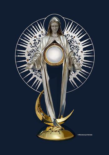 Co przedstawia Monstrancja Fatimska?Monstrancja Fatimska przedstawia Maryję - Niewiastę obleczoną w słońce, u której stóp znajduje się księżyc. W centrum, w sercu Niewiasty Eucharystii, znajduje się miejsce, w którym będzie umieszczany Najświętszy Sakrament. Niepokalane Serce Maryi to Dom Jezusa Chrystusa, Księcia Pokoju.