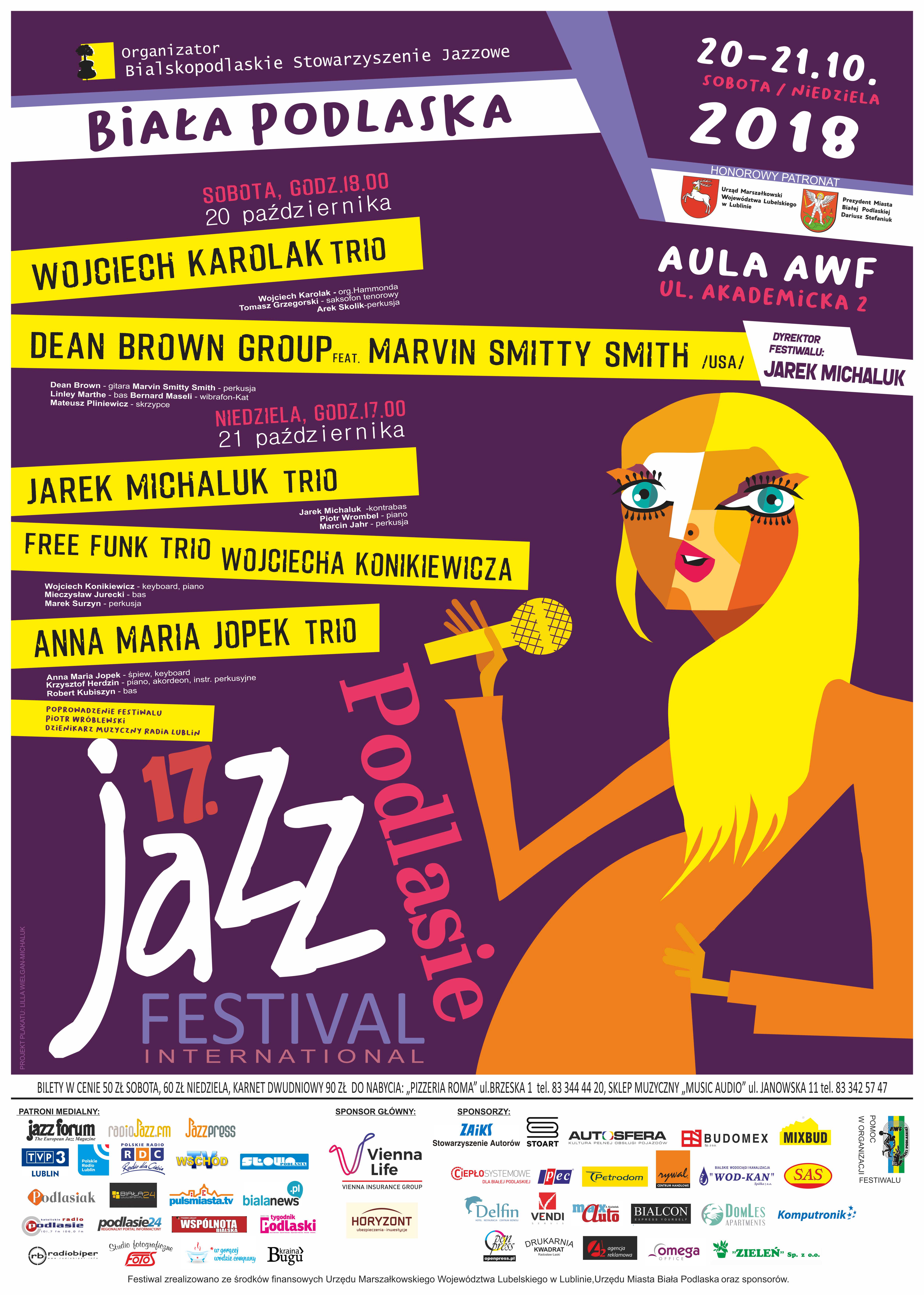 Najbliższa XVII edycja Podlasie Jazz Festiwalu zapowiada się bardzo interesująco, rozpocznie ją sobotni koncert wirtuoza organów Hammonda Wojciecha Karolaka i jego Trio świętującego w tym roku swoje 60- lecie pracy artystycznej, po nim usłyszymy jednego z najwybitniejszych amerykańskich gitarzystów- nowojorczyka Deana Browna z czołówką światowego jazzu. Niedzielny maraton rozpocznie od niedawna działające trio szefa festiwalu Jarka Michaluka w autorskim programie, po nim usłyszymy Free Funk Trio znakomitego pianisty i klawiszowca Wojciecha Konikiewicza reaktywowane specjalnie na festiwal. Podlaską ucztę jazzową zakończy koncert wyjątkowej wokalistki Anny Marii Jopek i jej Tria.