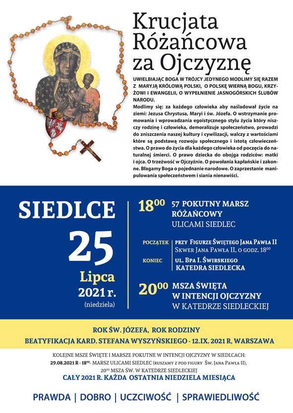 Tym razem rozpocznie się o godzinie 18,00. pod figurą (pomnikiem) św. Jana Pawła II.  Msza św. w intencji Ojczyzny zostanie odprawiona w katedrze siedleckiej o godzinie 20. 00.