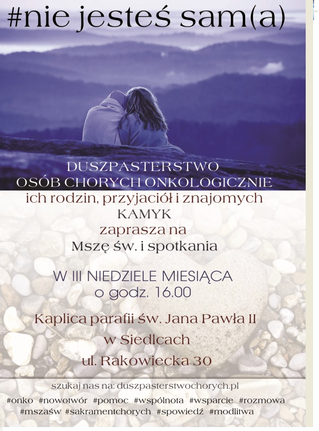 Powstałe w minionym roku siedleckie duszpasterstwo osób chorych onkologicznie, ich rodzin, przyjaciół i znajomych - z myślą o wsparciu osób chorych onkologicznie - zaprasza na kolejne spotkanie i Mszę św.  które odbędzie się w 20 marca w kaplicy parafii św. Jana Pawła II w Siedlcach, przy ul. Rakowieckiej 30.