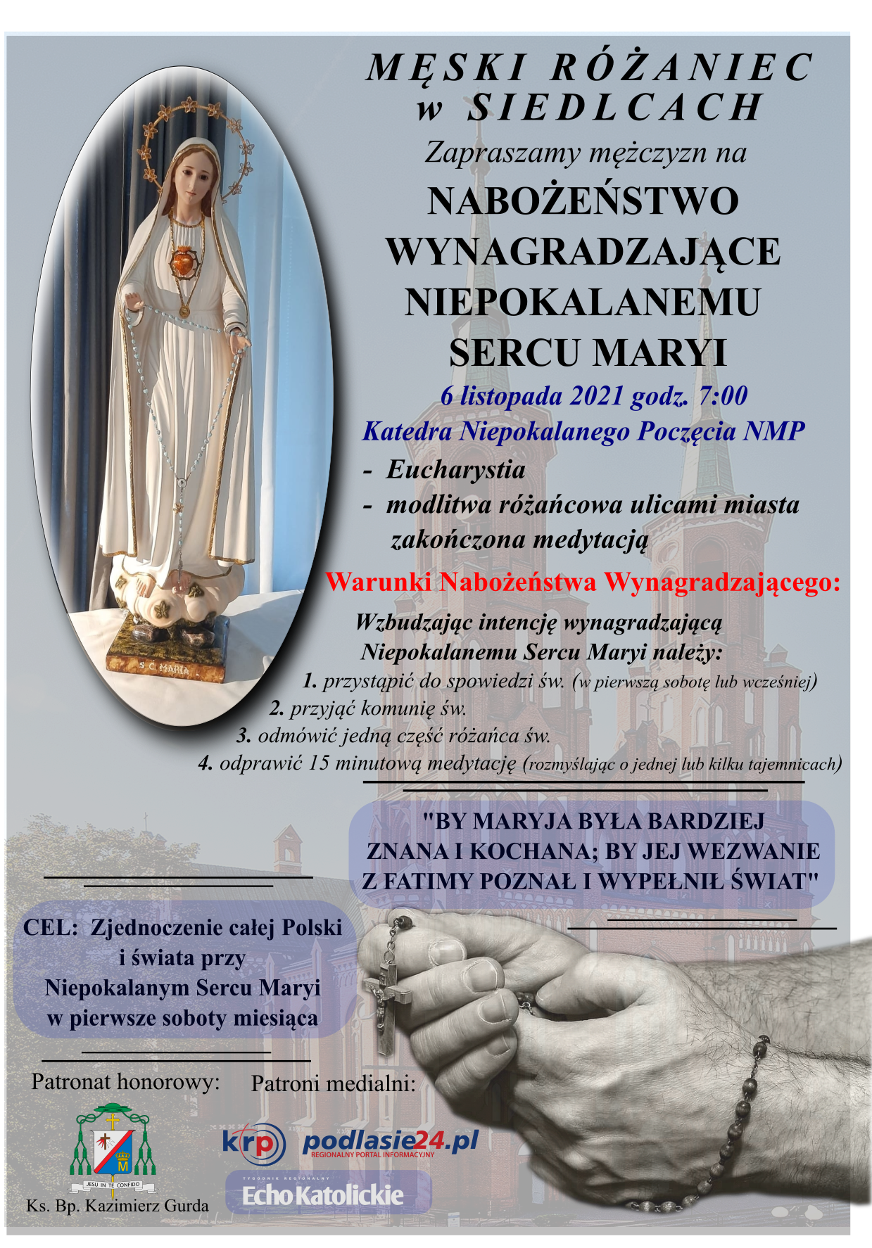 Mężczyźni ze inicjatywy Męski Różaniec w Siedlcach po raz XXI zapraszają na nabożeństwo wynagradzające Niepokalanemu Sercu Maryi w pierwszą sobotę, 6 listopada.