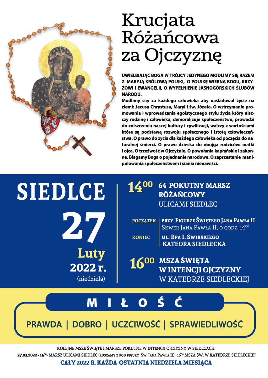 W niedzielę 27 lutego, odbędzie się comiesięczny Pokutny Marsz Różańcowy ulicami Siedlec w intencji naszej Ojczyzny.