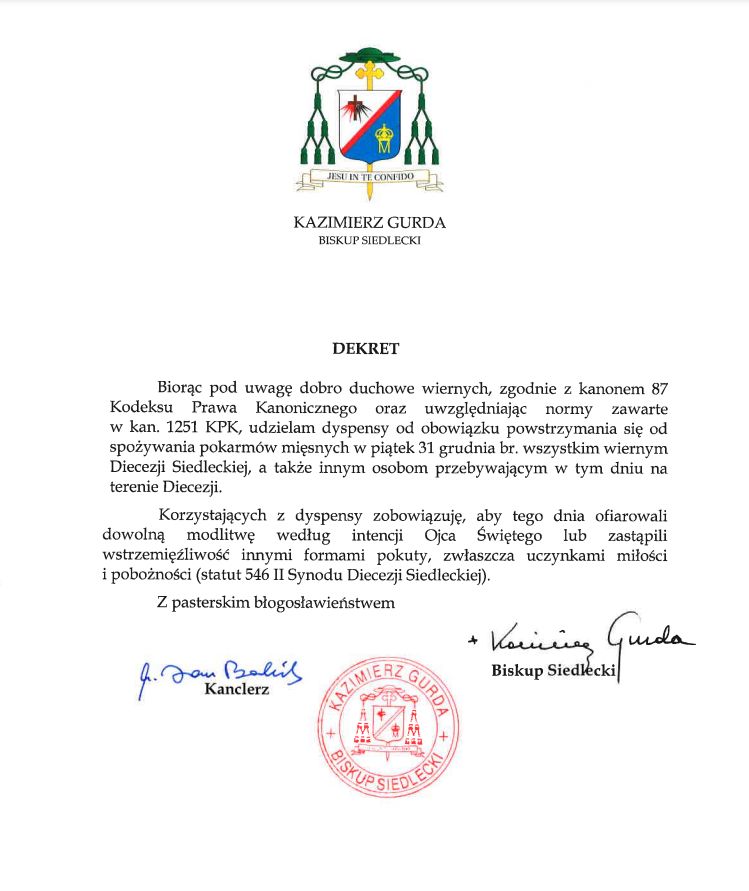 Biskup Kazimierz Gurda udzielił wiernym z diecezji siedleckiej dyspensy od obowiązku zachowania wstrzemięźliwości od pokarmów mięsnych i innych form pokuty 31 grudnia, czyli w Sylwestra.