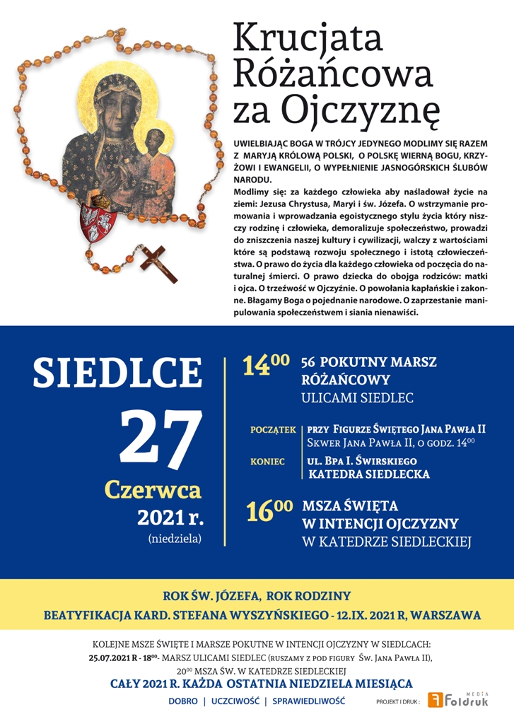 W niedzielę, 27 czerwca ulicami Siedlec przemaszeruje 56 Pokutny Marsz Różańcowy. Początek o godzinie 14.00 pod figurą (pomnikiem) św. Jana Pawła II.