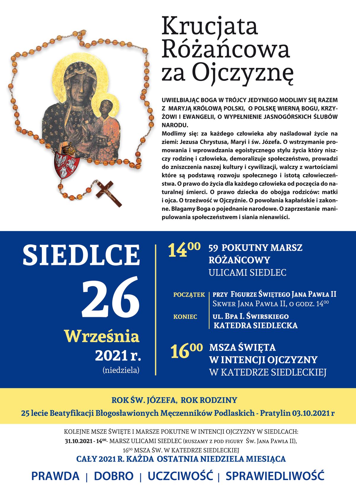 W niedzielę, 26 września ulicami Siedlec przemaszeruje 59 Pokutny Marsz Różańcowy. Początek o godzinie 14.00 przy pomniku św. Jana Pawła II.
