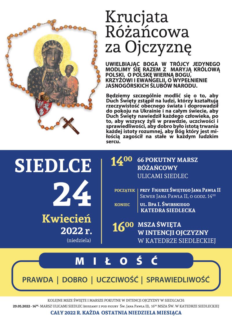 24 kwietnia po raz kolejny ulicami Siedlec przejdzie marsz zorganizowany przez Krucjatę Różańcową za Ojczyznę. Marsze odbywają się w każdą ostatnią niedzielę miesiąca.