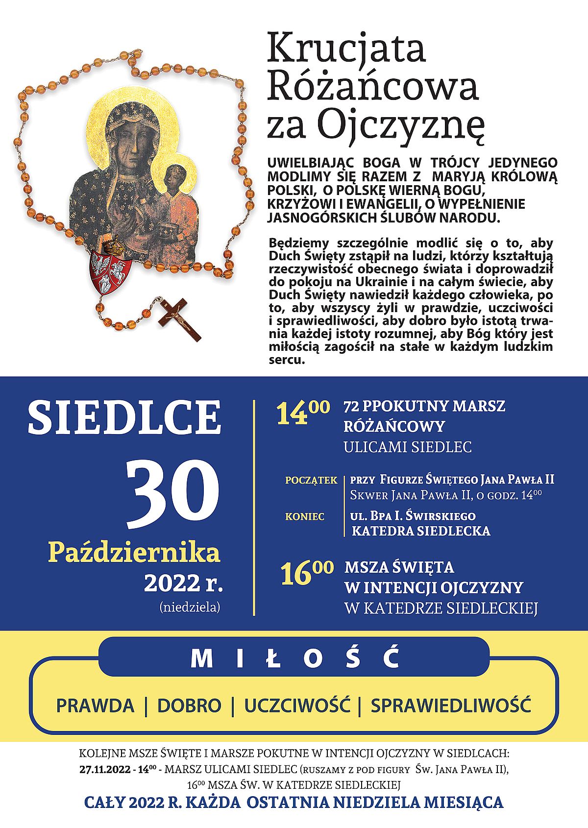W niedzielę, 30 października ulicami Siedlec przejdzie comiesięczny Pokutny Marsz Różańcowy w intencji Ojczyzny. Początek o godz. 14.00 przy pomniku św. Jana Pawła II.
