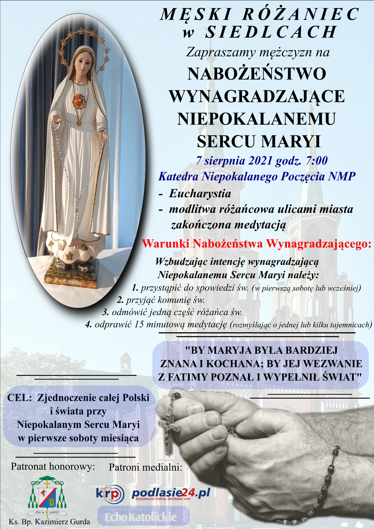 Spotkanie modlitewne rozpocznie o godz. 7.00 się Eucharystią w siedleckiej katedrze. Po Mszy Św. dalsza część nabożeństwa. Różaniec i medytacja jednej z tajemnic podczas przemarszu i na placu przed figurą Matki Bożej przy ul. Starowiejskiej 13.