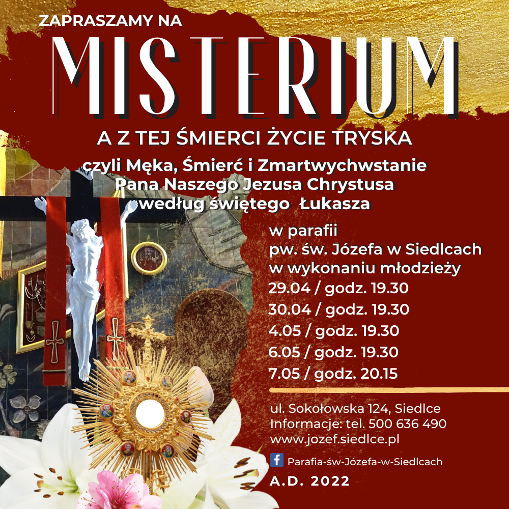 29 kwietnia w Sanktuarium św. Józefa w Siedlcach będzie miało miejsce Misterium Męki, Śmierci i Zmartwychwstania Jezusa Chrystusa według świętego Łukasza.