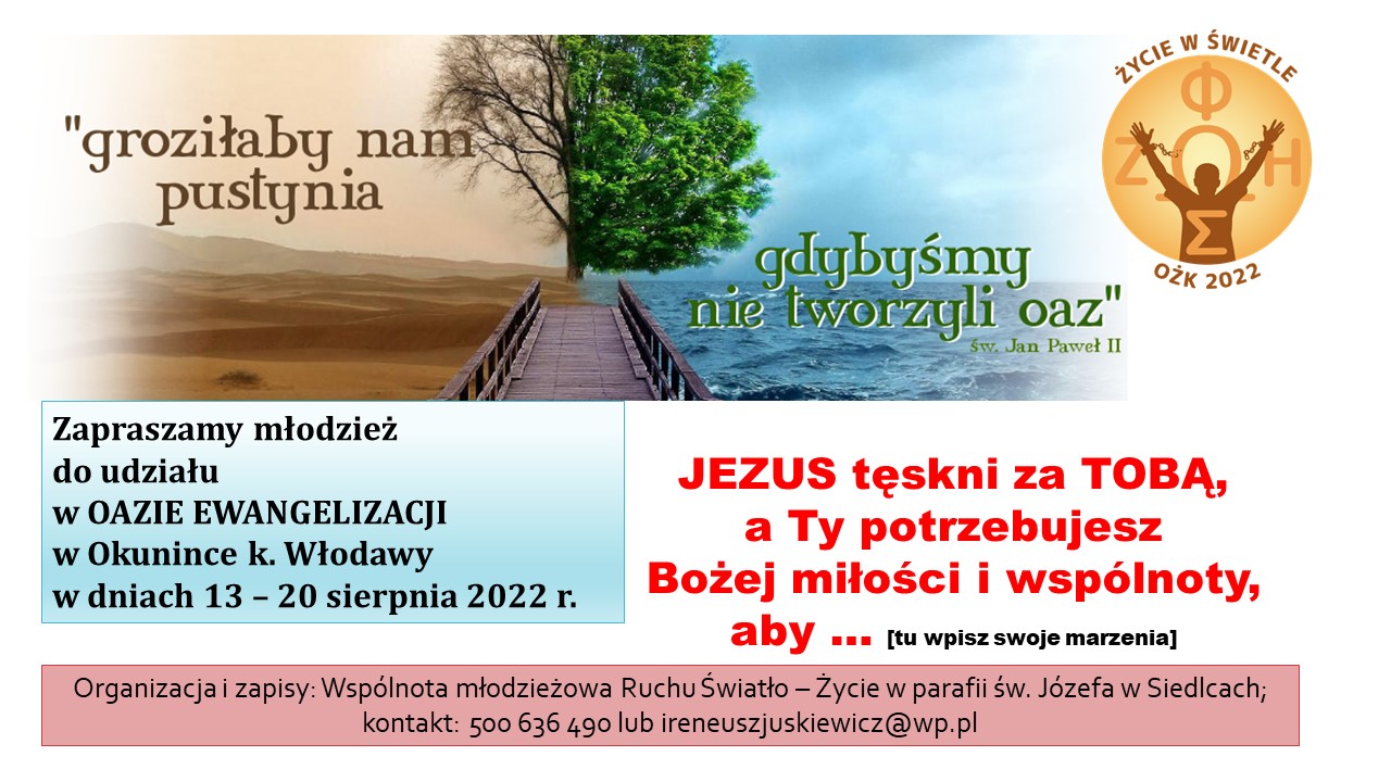 Organizatorzy wskazują, że jest jeszcze 20 wolnych miejsc. Zgłoszenia do 8 sierpnia lub wyczerpania miejsc. Koszt wyjazdu tygodniowego z pełnym wyżywieniem i dojazdem to 650 zł. Istnieje możliwość dofinansowania, aby każdy chętny mógł pojechać i skorzystać. Wyjazd na oazę jest wspólnym autokarem z parkingu przy parafii św. Józefa w Siedlcach 13 sierpnia o godz. 10.00. Można dojechać też indywidualnie.