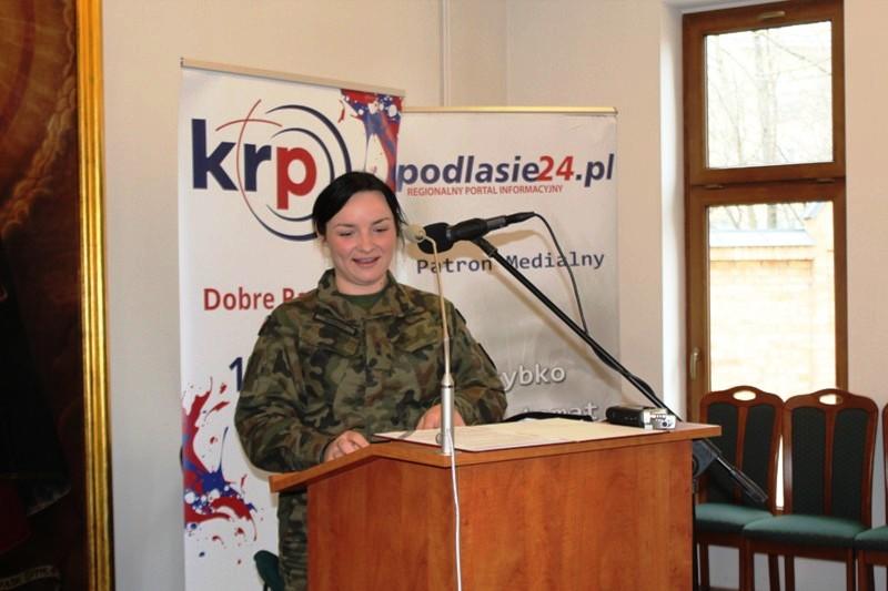Kolejnym punktem programu było wystąpieniePani Podporucznik Bernadety Słoneckiej, która podzieliła się doświadczeniem służby w armii. – Moja rodzina zawsze mnie wspierała, pozytywnie zareagowała na moją drogę zawodową i myślę, że są ze mnie dumni, przede wszystkim moja babcia, której tata, jak i mąż, służyli w wojsku, więc te tradycje są zakorzenione w mojej rodzinie. Zaznaczyła, że w służbie wojskowej bardzo ważna jest kondycja fizyczna i psychiczna. W swoim wystąpieniu wiele mojsca poświęciła obecności kobiet w wojsku. Podkreśliła, że ich liczba w wojsku polskim stale wzrasta.– Na przestrzeni lat kobieta żołnierz zdobywała uznanie, co można zauważyć w zajmowaniu przez kobiety wysokich stanowisk. W mojej jednostce wojskowej aktualnie pełni służbę 15% kobiet, są na wszystkich stanowiskach i we wszystkich korpusach – od szeregowego do oficerów. Mam koleżanki, które służą w batalionie czołgów, są działonowymi, strzelcami wyborowymi, ale również pracują w sztabach – zaznaczyła. Poruszyła także temat współpracy wojska z cywilami. Wyjaśniła, że udostępnianie zdjęć, filmów dokumentujących ruchy wojsk, przemieszczanie się kolumn może stanowić źródło informacji dla obcych wywiadów.