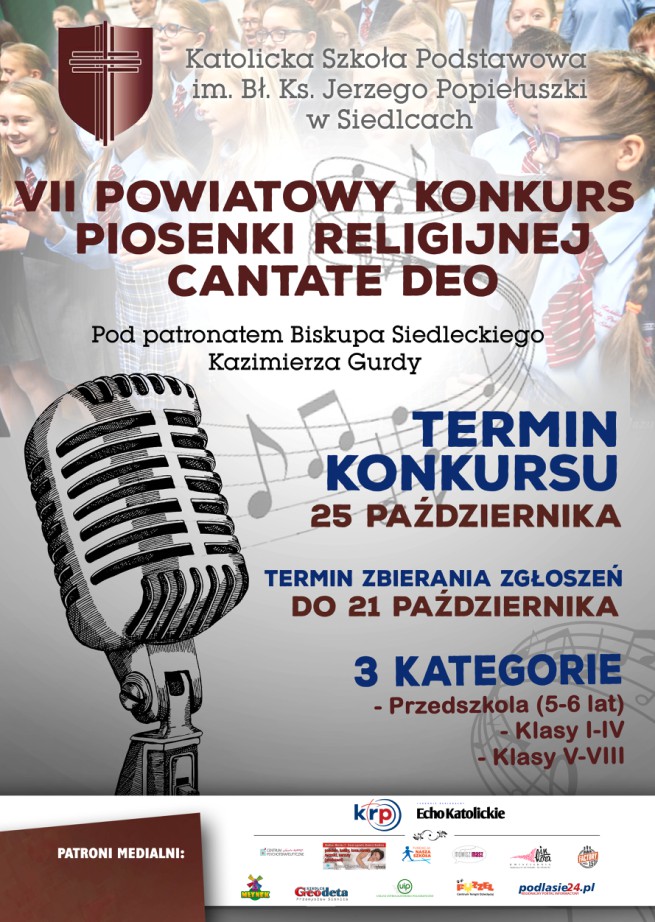 Katolicka Szkoła Podstawowa im. Bł. ks. Jerzego Popiełuszki w Siedlcach organizuje VII edycję Konkursu Piosenki Religijnej „Cantate Deo”. Wydarzenie odbędzie się 25 października.