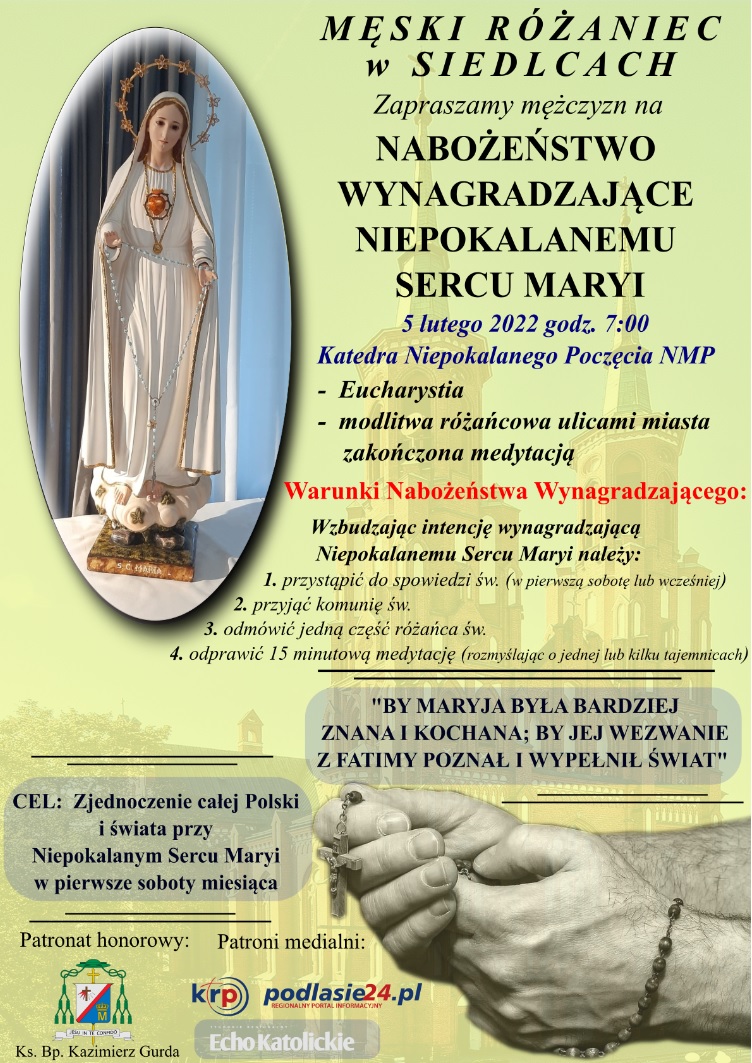 W 1946 roku przed uroczystym poświęceniem Polski Niepokalanemu Sercu Najświętszej Maryi Panny Ks. Kardynał August Hlond wołał, nie chodzi tylko o jednorazowe choćby najbardziej uroczyste oddanie się Jej Sercu, ale o systematyczne, stale się powtarzające, w konkretne formy ujęte nabożeństwo do Jej Serca, a Św. Jan Paweł II w 1982 w Fatimie po akcie poświęcenia świata Niepokalanemu Sercu Maryi mówił, że wezwanie Maryi nie jest jednorazowe i Jej apel musi być podejmowany z pokolenia na pokolenie, zgodnie z coraz nowymi znakami czasu. Dlatego też w ramach Inicjatywy Męski Różaniec w Siedlcach po raz XXIII, a także w wielu innych miastach Polski w pierwsze soboty gromadzą się mężczyźni, aby w męskiej wspólnocie odpowiadać na prośbę Maryi i swoim świadectwem zachęcać innych do praktykowania uroczystego obchodzenia pierwszych sobót miesiąca.