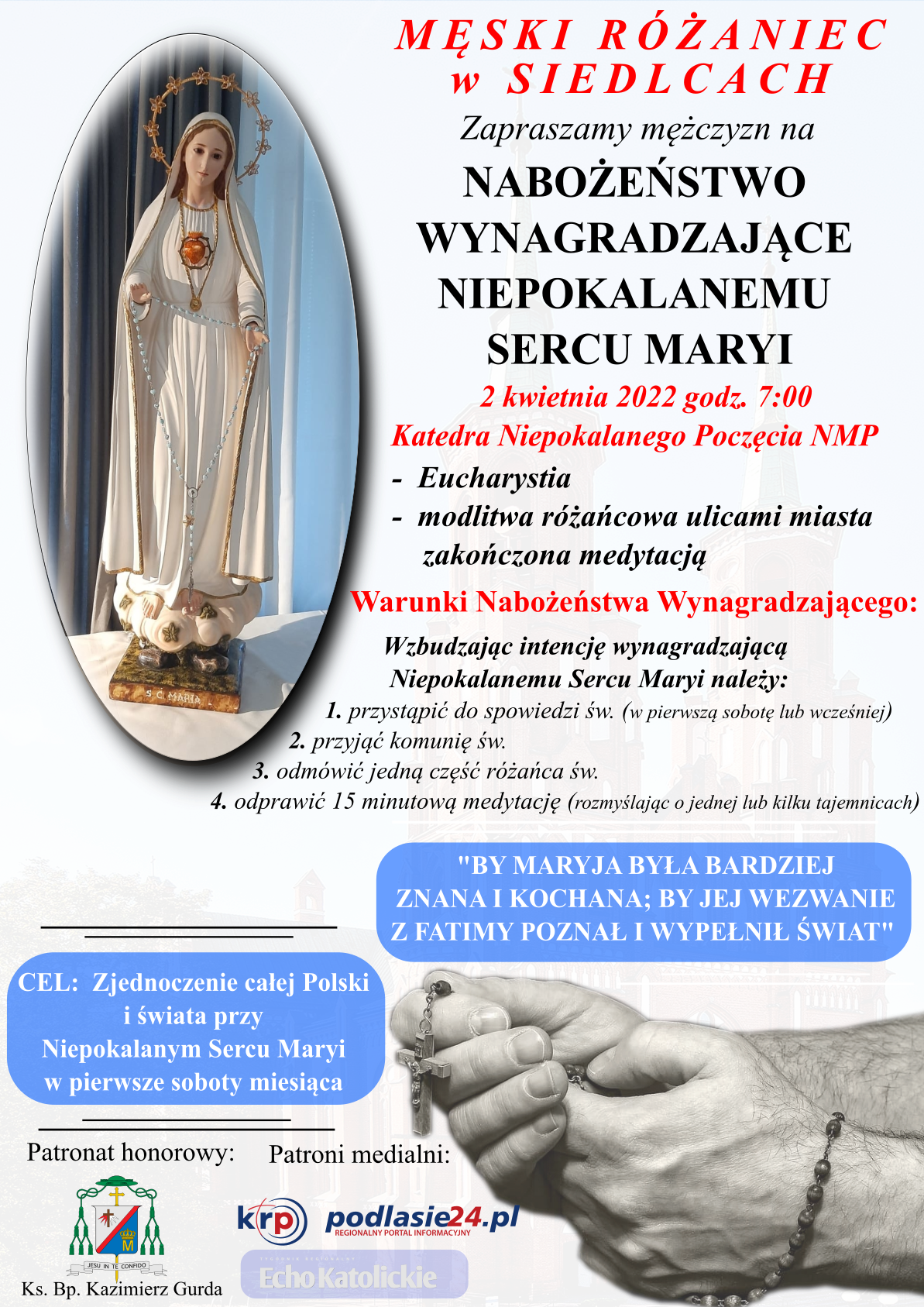 Spotkanie modlitewne w sobotę 2 kwietnia rozpocznie się Eucharystią w siedleckiej katedrze o godz. 7.00. Po Mszy Świętej przewidziana jest dalsza część nabożeństwa. Różaniec mężczyzn podczas przemarszu ulicami miasta do figury Matki Bożej przy ul. Starowiejskiej 13. Tam medytacja nad jedną z tajemnic, a na zakończenie Apel Jasnogórski i błogosławieństwo kapłanów.