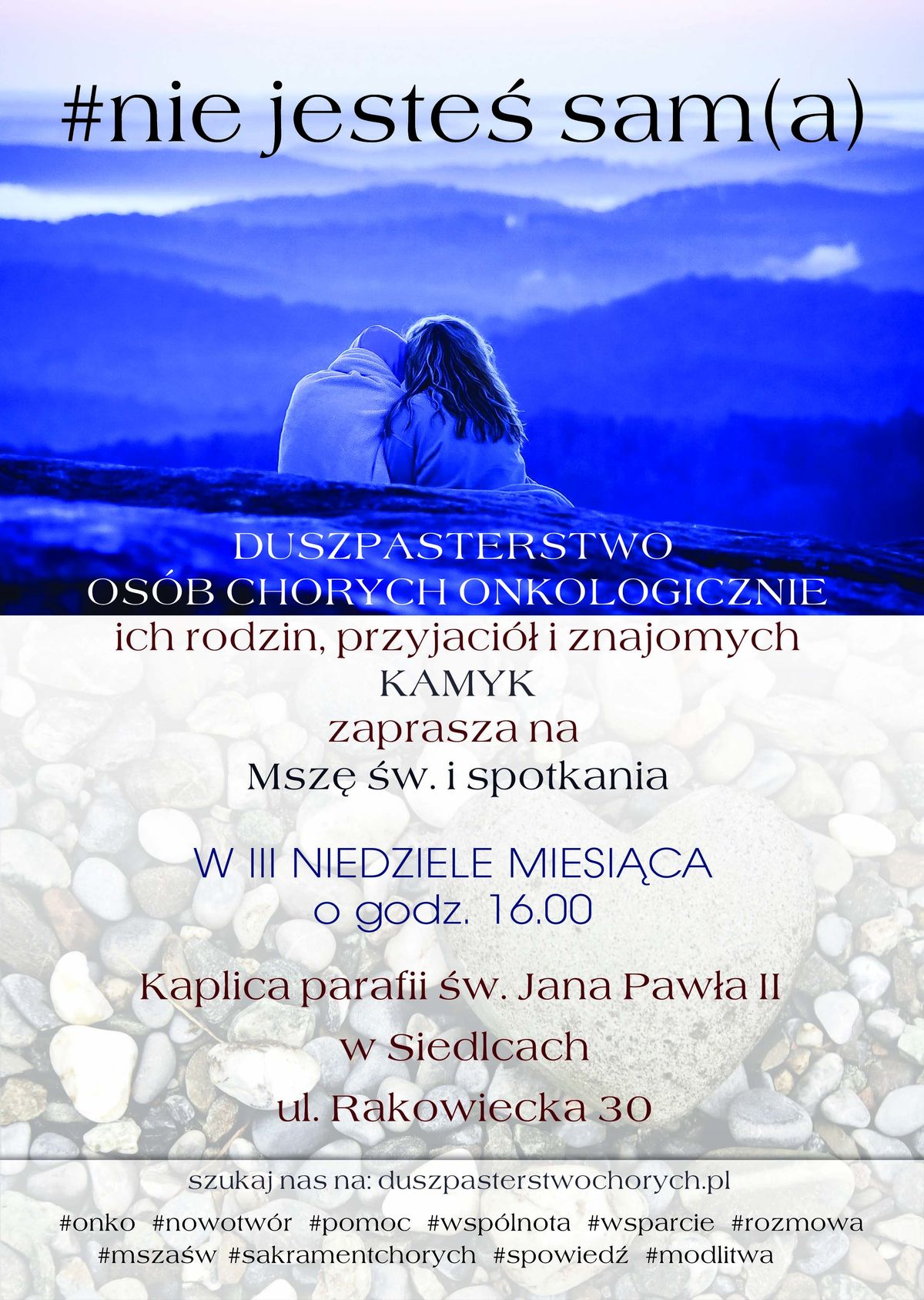 Powstałe w minionym roku siedleckie duszpasterstwo osób chorych onkologicznie, ich rodzin, przyjaciół i znajomych - z myślą o wsparciu osób chorych onkologicznie - zaprasza na kolejne spotkanie, które odbędzie się w najbliższą niedzielę, 15 maja w kaplicy parafii św. Jana Pawła II w Siedlcach, przy ul. Rakowieckiej 30.
