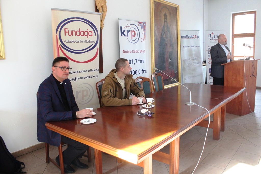 Krzysztof Plażuk powiedział, że po odejściu z armii, powrócił z żoną i dziećmi w rodzinne strony do Janowa Podlaskiego i podjął pracę jako nauczyciel w klasach mundurowych. Jednym z tematów, które poruszył w swoim wystąpieniu była działalność Fundacji Orla Straż. – Ta fundacja ratuje ofiary terroryzmu w północnym Iraku. Pomaga stanąć tym ludziom na nogi, buduje domy, odtwarza miejsca pracy, prowadzi dwa ośrodki edukacyjne dla sierot, prowadzi kursy dla kobiet – zaznaczył. Dodał, że Bartosz Rutkowski założył tę fundację w 2015 r. pod wypływem wydarzeń z Syrii – ukrzyżowania 12-letniego chłopca przez terrorystów. – To, co zobaczył sprawiło, że zaczął planować założenie fundacji. 4 miesiące później zrezygnował z armii i założył fundację – przyznał.