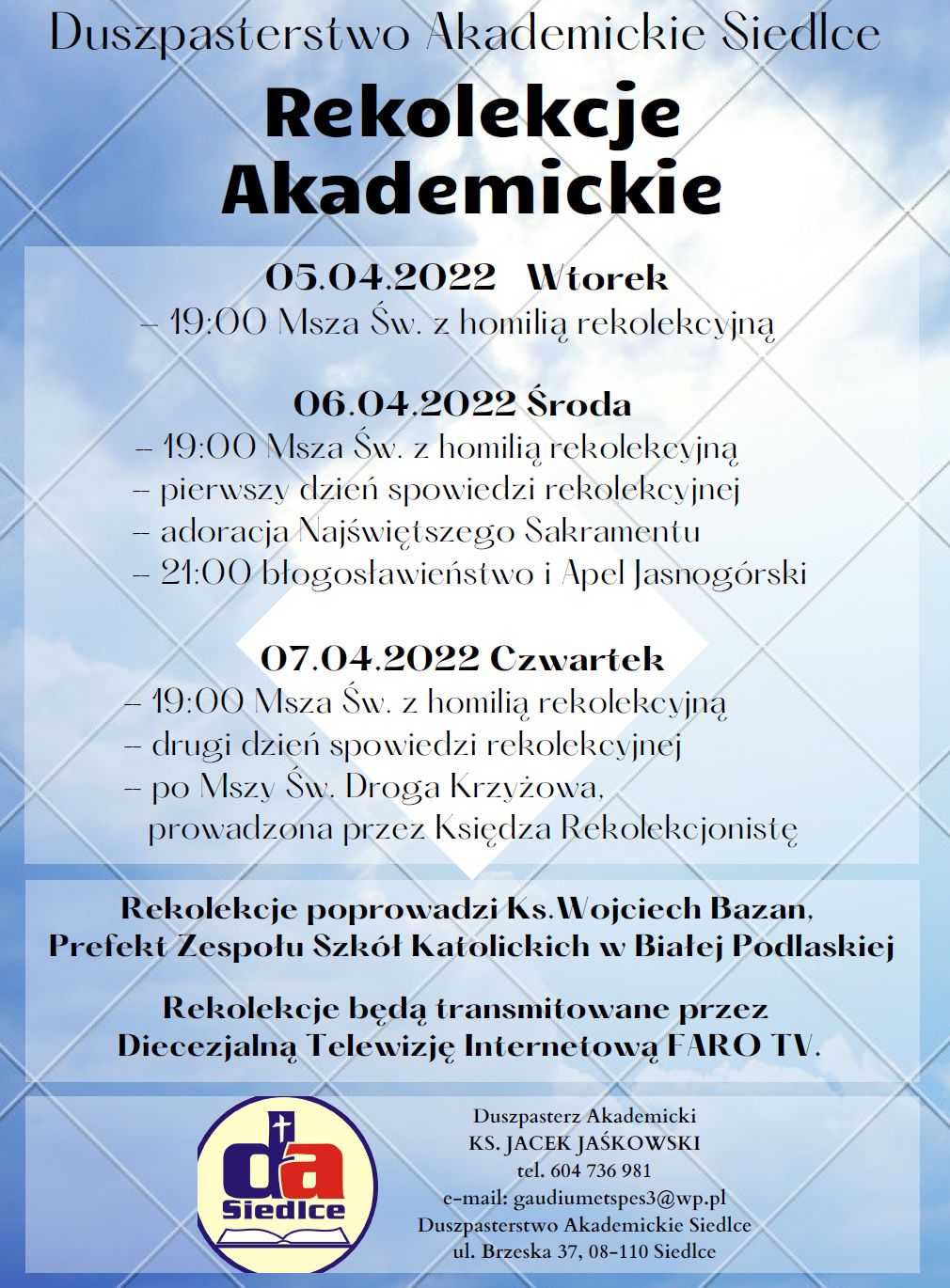 5 kwietnia rozpoczęły się w Siedlcach Rekolekcje Akademickie.  Spotkania prowadzi ks. Wojciech Bazan, Prefekt Zespołu Szkół Katolickich w Białej Podlaskiej.
