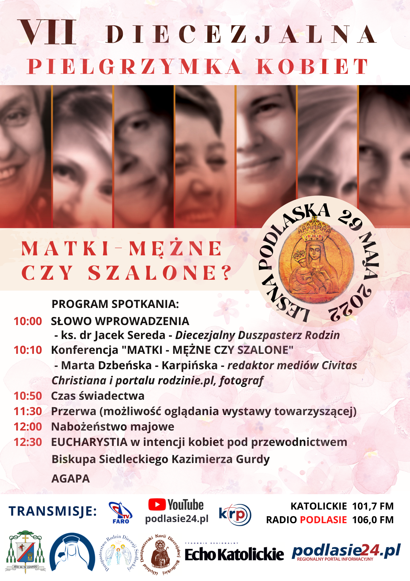 Odkrywanie piękna powołania kobiety i modlitwa za kobiety naszej diecezji to cel VII Diecezjalnej Pielgrzymki Kobiet. Wyjątkowo w tym roku (z racji niepokoju przy granicy polsko-białoruskiej) nasza pielgrzymka nie odbędzie się w Pratulinie, ale w sanktuarium maryjnym w Leśnej Podlaskiej. Hasło tegorocznej pielgrzymki brzmi: Matki mężne czy szalone? Spotkajmy się na modlitwie w niedzielę 29 maja o godz. 10.00.