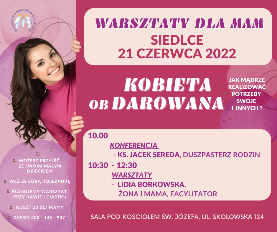 21 czerwca w Siedlcach odbędą się warsztaty dla Mam zatytułowane „KOBIETA obDAROWANA”. Do udziału w wydarzeniu zaprasza Duszpasterstwo Rodzin Diecezji Siedleckiej.