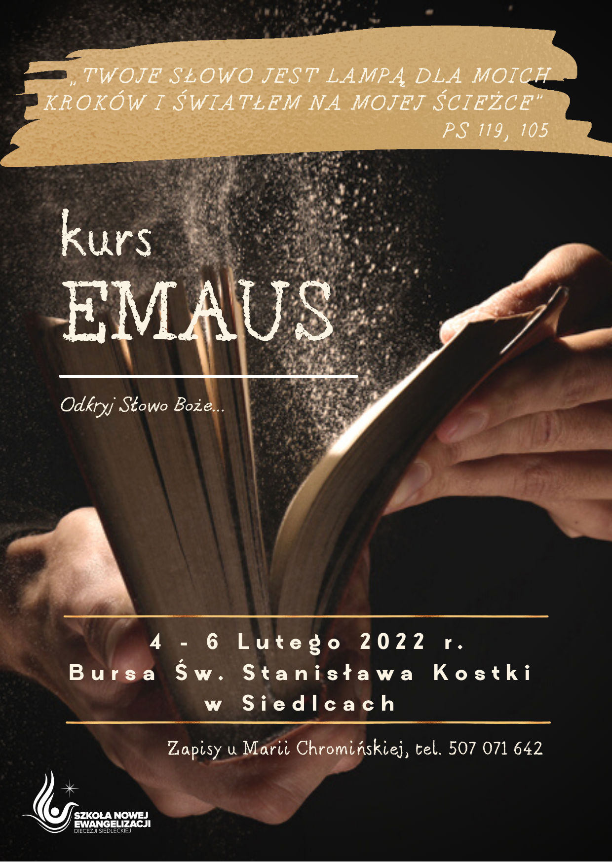 Szkoła Nowej Ewangelizacji Diecezji Siedleckiej planuje w lutym zorganizować kolejny kurs ewangelizacyjny „Emaus”. Odbędzie się on w terminie 4-6 lutego. Kurs daje szansę osobistego doświadczenia mocy Słowa Bożego.