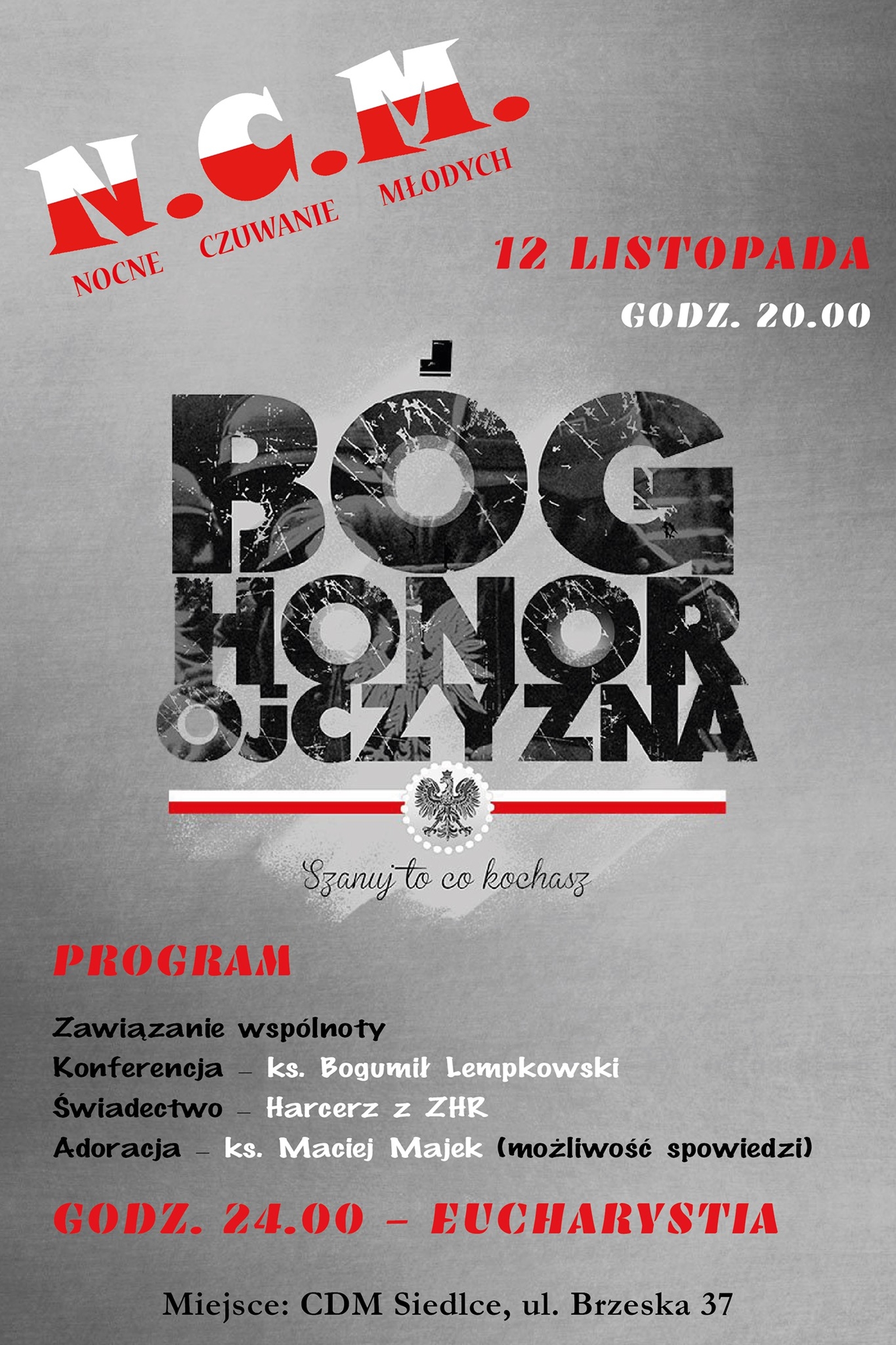 12 listopada w kaplicy Centrum Duszpasterstwa Młodzieży przy ul. Brzeskiej w Siedlcach odbędzie się Nocne Czuwanie Młodych. Jako, że wydarzenie zaplanowano dzień po 11 listopada, tematem spotkania będą słowa: Bóg, Honor, Ojczyzna.