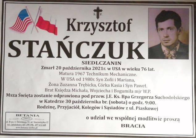 Ks. Michał Stańczuk, emerytowany kapłan diecezji siedleckiej, zawiadamia przyjaciół i znajomych o śmierci swojego brata. Śp. Krzysztof Stańczuk, siedlczanin od 1980 roku mieszkający w USA, zmarł 20 października w wieku 76 lat.