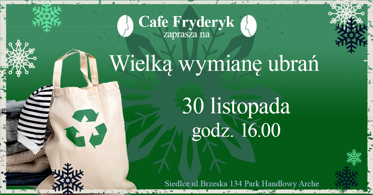 „Wielka Wymiana Ubrań”  to akcja w duchu zero waste skierowana do pań. Każda kobieta może przynieść swoje ubrania, których już nie nosi, ale są one w dobrym stanie i wymienić się z innymi uczestniczkami. Akcja ma wiele dobrych stron: oszczędność, ochrona środowiska oraz spędzanie czasu na doskonałej zabawie i ciekawych rozmowach dotyczących mody. "Biletem wstępu" będzie jedynie zakup kawy/herbaty/ciasta z kawiarnianej oferty. Po wymianie ubrań odbędą się warsztaty podczas których profesjonalna kiperka herbaty, Marlena Drygas przedstawi historię herbaty i opowie, jak parzyć różne jej rodzaje, by miały najlepszy smak. Będzie też mowa o tym, jak powstają różne smaki herbat, jakich składników używa się do produkcji i w jaki sposób je łączyć. Marlena Drygas powie także o wadze rytuałów i dobrych nawyków w życiu.