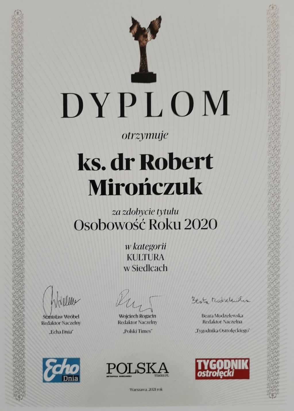 Dyrektor Muzeum Diecezjalnego w Siedlcach ks. dr Robert Mirończuk otrzymał od Kolegium Redakcyjnego Polski Times tytuł OSOBOWOŚĆ ROKU 2020 w kategorii Kultura. Wyróżniona została również Joanna Woszyczyńska - kierownik i choreograf Formacji Tańca Nowoczesnego LUZ i Alternatywnego Teatru Tańca LUZ.