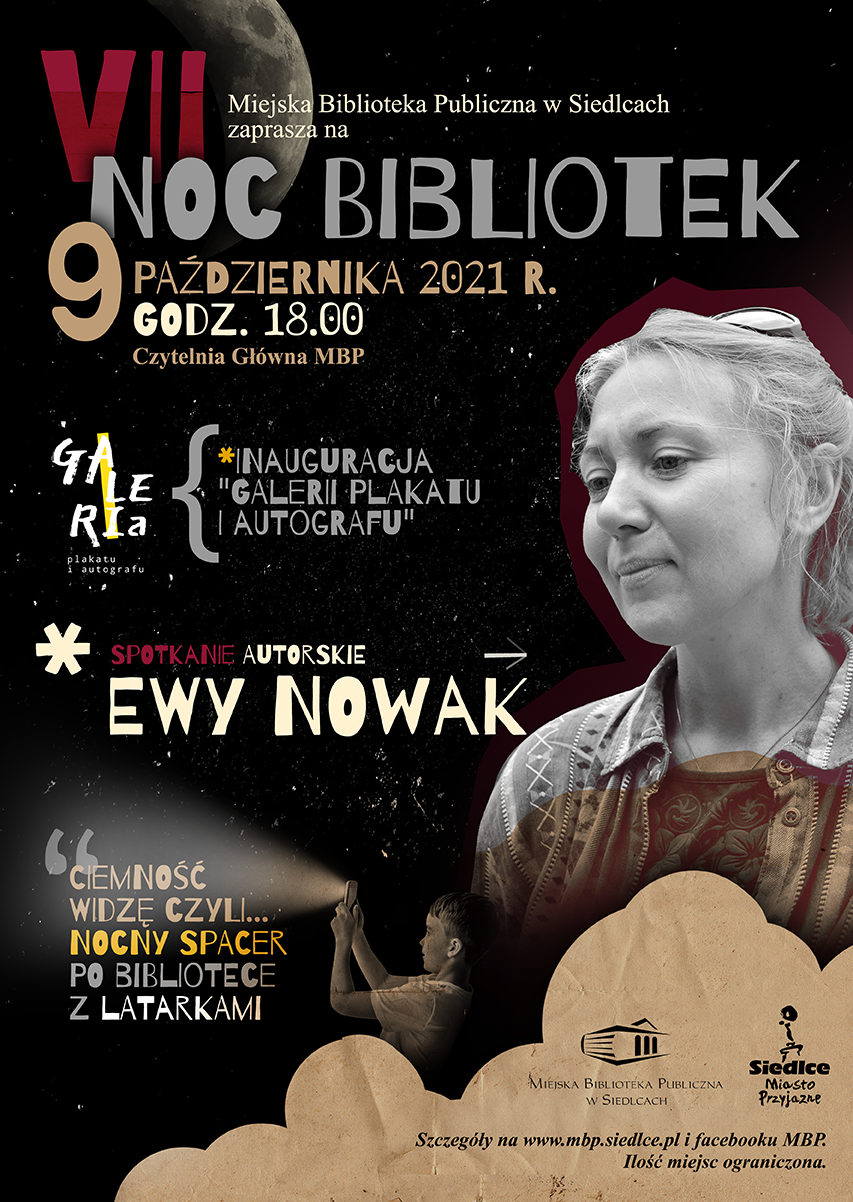 Miejska Biblioteka Publiczna w Siedlcach zaprasza na VII Noc Bibliotek. Wieczór rozpocznie się od inauguracji „Galerii Plakatu i Autografu”, która gromadzi plakaty promujące wydarzenia odbywające się w MBP. Dodatkową wartością kolekcji są autografy osobistości odwiedzających bibliotekę min. Hanny Krall, Ernesta Brylla, Andrzeja Stasiuka, Wiesława Myśliwskiego, Joanny Bator i innych.