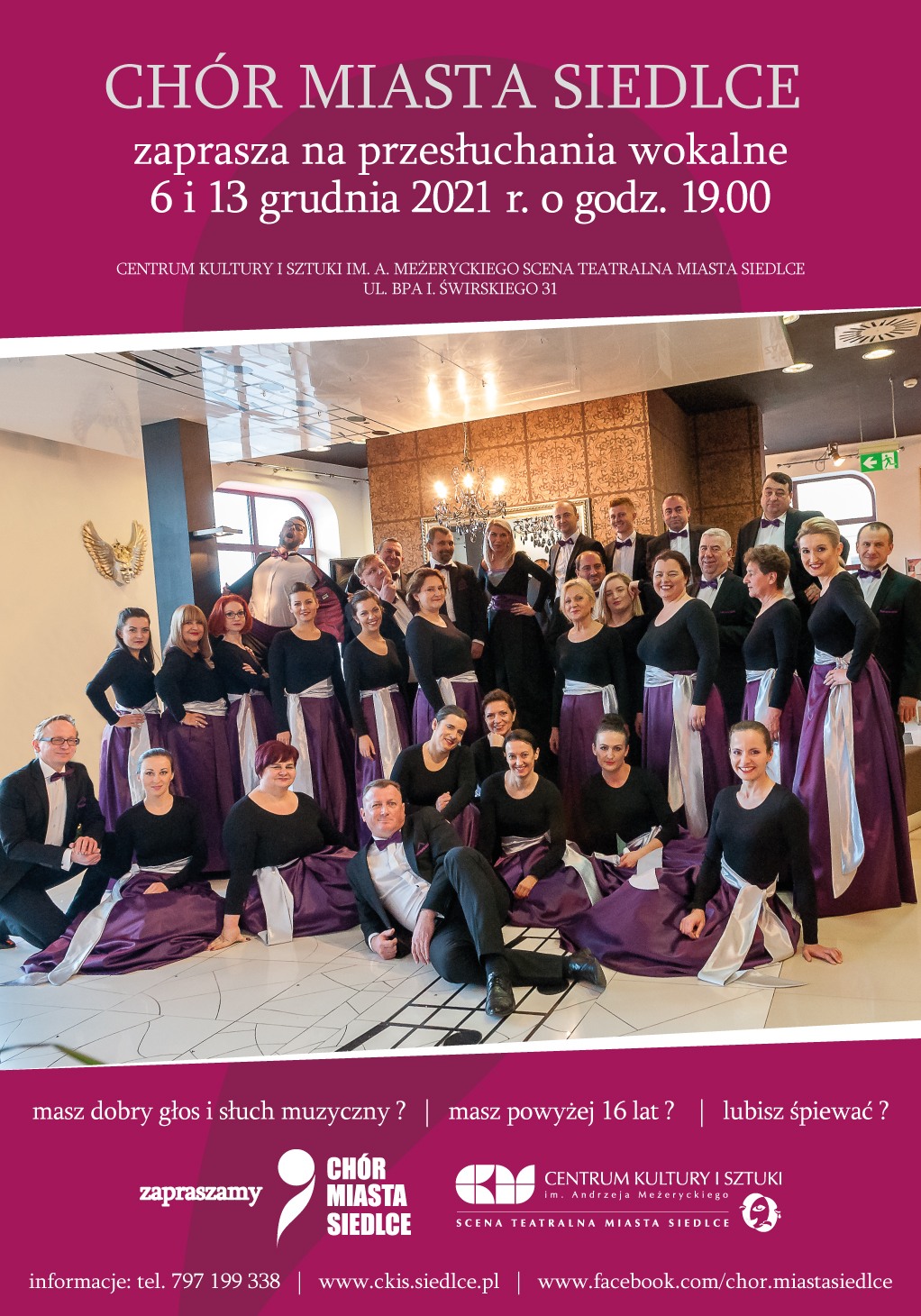 Chór Miasta Siedlce zaprasza na przesłuchania wokalne, które odbędą się 6 i 13 grudnia o godz. 19:00 w Centrum Kultury i Sztuki im. A. Meżeryckiego Scena Teatralna Miasta Siedlce.
