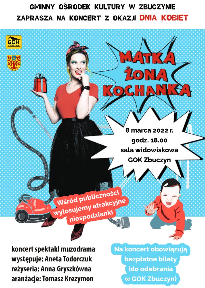 We wtorek 8 marca o godzinie 18.00 na scenie Ośrodka zostanie wystawiony spektakl „Matka, żona, kochanka” w wykonaniu Anety Todorczuk. Aktorka teatralna i telewizyjna przedstawi zbiór obserwacji z życia – lekko ironiczne spojrzenie na próbę pogodzenia tych trzech społecznych ról.