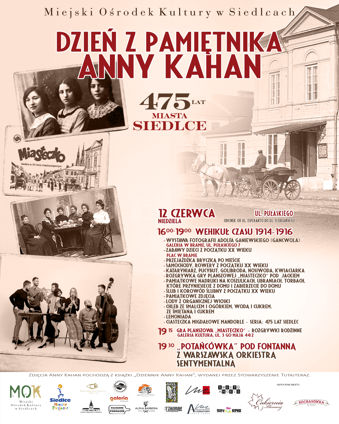 Dzięki naszemu „wehikułowi czasu” będziecie mogli przez chwilę poczuć się jak mieszkańcy Siedlec z pierwszego dwudziestolecia ubiegłego wieku. Na ulicy Pułaskiego, która tego dnia zmieni się w ulicę „Piękną”, spotkacie fotografa, pucybuta, nosiwodę, portrecistę, kataryniarza, golibrodę, a także zwykłych mieszkańców i dzieci z tamtego okresu. Na pewno pojawią się stare samochody, rowery i bryczka. Wszyscy chętni będą mogli spróbować wyjątkowych lodów, lemoniady, ciasteczek migdałowych „Mandorle” (seria 475 lat Siedlce) czy chleba ze smalcem oraz wykonać pamiątkowe nadruki na ubraniach. W Galerii „w Bramie” dostępna będzie wystawa fotografii archiwalnych Adolfa Ganiewskiego (Gancwola) ze zbiorów Muzeum Regionalnego w Siedlcach. Dzięki Stowarzyszeniu Tutajteraz będziecie mogli zagrać w grę planszową „Miasteczko. Siedlce w XX-leciu międzywojennym”. Na koniec, o godz. 19:30, zapraszamy na Skwer przy fontannie na potańcówkę i koncert Warszawskiej Orkiestry Sentymentalnej – zespołu rozsmakowanego w melodiach polskiej przedwojennej rewii i kabaretu, który inspiruje się piosenkami i pieśniami Adama Astona, Wiery Gran czy Mieczysława Fogga, aranżacjami Henryka Warsa i Rostworowskiego, wykonaniami orkiestr Golda i Petersburskiego, Karasińskiego i Kataszka - informuje Miejski Ośrodek Kultury w Siedlcach.