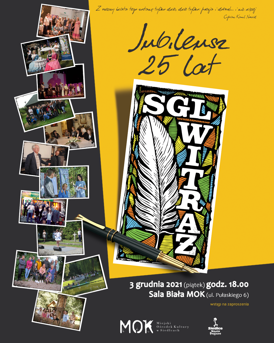 Wstęp na zaproszenia. Zaproszenia do odbioru od 23 listopada w kasie MOK, ul. Sienkiewicza 63, od poniedziałku do piątku w godz. 9:00-16:45. Liczba zaproszeń ograniczona.