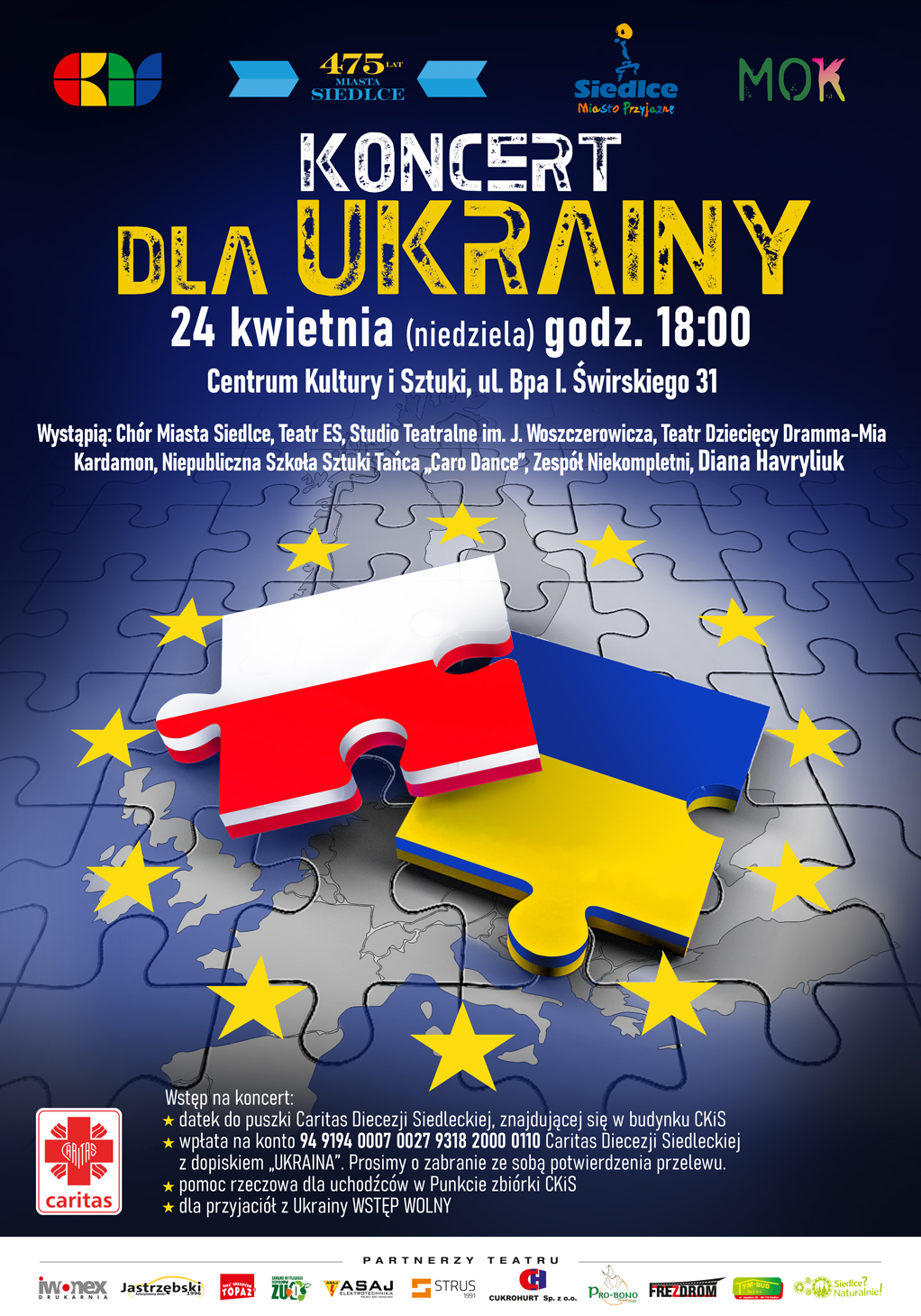 Na Scenie Teatralnej Miasta Siedlce wystąpią artyści Centrum Kultury i Sztuki oraz zaproszeni goście. Koncert rozpocznie Chór Miasta Siedlce uroczystym wykonaniem narodowego hymnu Polski i Ukrainy oraz Poloneza Ogińskiego. W dalszej części widowiska w różnorodnym repertuarze zaprezentują się m.in. Teatr ES, Studio Teatralne im. J. Woszczerowicza, Teatr Dziecięcy Dramma-Mia, Kardamon, Zespół Niekompletni z Miejskiego Ośrodka Kultury w Siedlcach, tancerze Niepublicznej Szkoły Sztuki Tańca Caro Dance oraz Diana Havryliuk. Podczas koncertu prowadzona będzie zbiórka pieniężna, która w całości przekazana zostanie na rzecz pomocy uchodźcom z Ukrainy oraz miasta partnerskiego Siedlec, Berdyczowa.