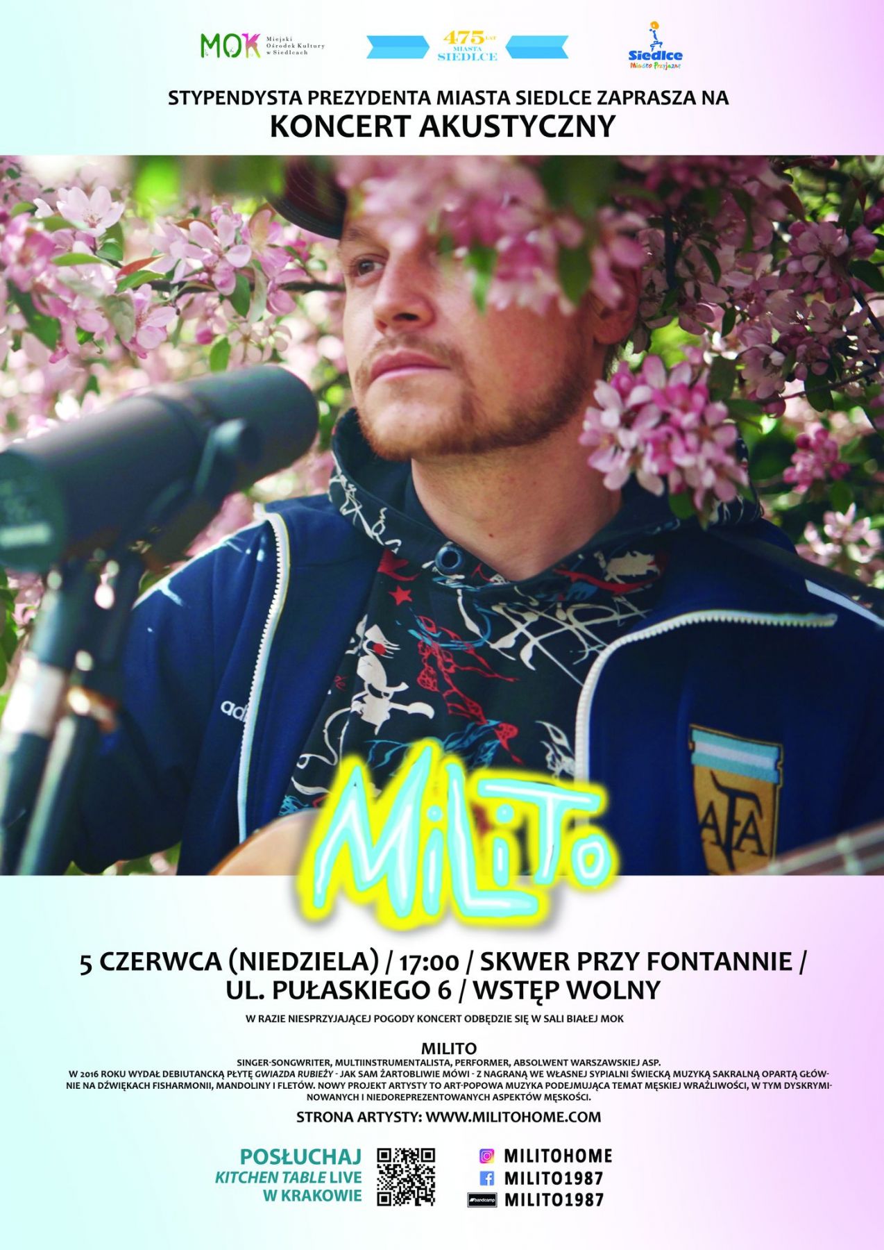 Jego nowy projekt to art-popowa muzyka podejmująca temat męskiej wrażliwości, w tym dyskryminowanych i niedoreprezentowanych aspektów męskości. Podczas koncertu na Skwerze przy fontannie, Milito zaprezentuje swoje najnowsze piosenki w wersji akustycznej, w tym trzy utwory, których profesjonalne nagranie umożliwiło stypendium Prezydenta Miasta Siedlce Andrzeja Sitnika.