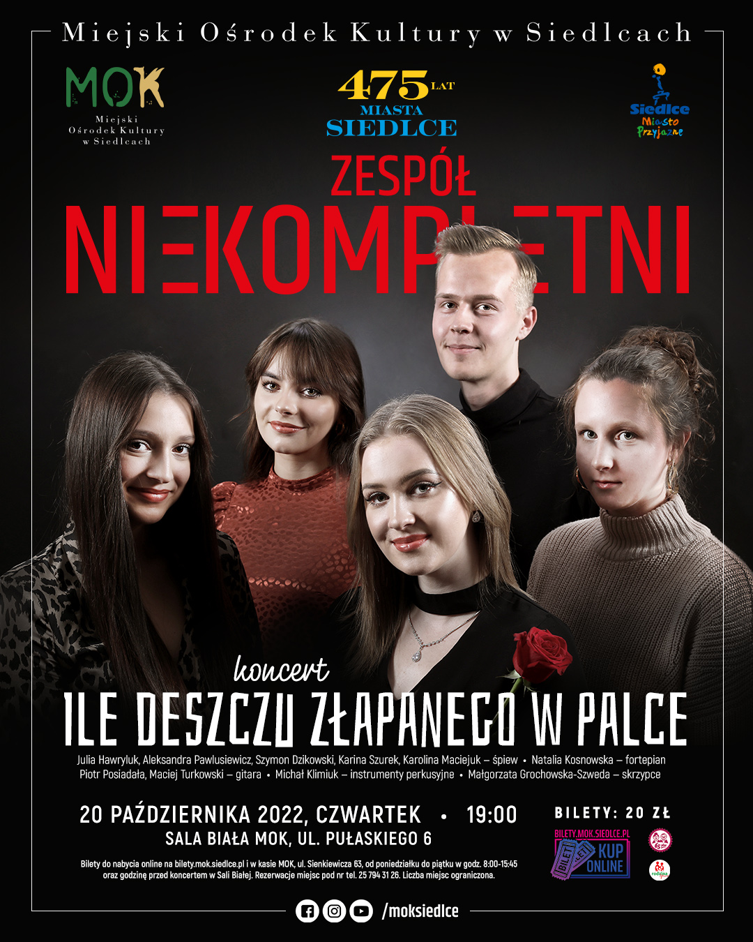 - Podczas koncertu zatytułowanego „Ile deszczu złapanego w palce”, na który zapraszamy 20 października do Sali Białej, w zespole zadebiutują nowi wokaliści: Julia Hawryluk, Aleksandra Pawlusiewicz i Szymon Dzikowski. Oczywiście usłyszymy także doskonale znane już siedleckiej publiczności Karinę Szurek i Karolinę Maciejuk. Akompaniował im będzie zespół w składzie: Natalia Kosnowska – fortepian, Małgorzata Grochowska-Szweda – skrzypce, Michał Klimiuk – instrumenty perkusyjne, Piotr Posiadała – gitara, Maciej Turkowski – gitara – informuje MOK.