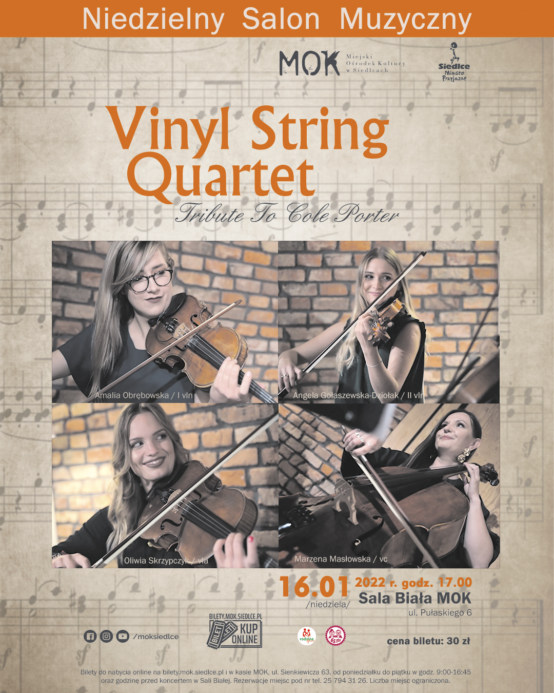 Bilety w cenie 30 zł do nabycia online na bilety.mok.siedlce.pl i w kasie MOK, ul. Sienkiewicza 63, od poniedziałku do piątku w godz. 9:00-16:45 oraz godzinę przed koncertem w Sali Białej. Rezerwacje miejsc pod nr tel. 25 794 31 26. Liczba miejsc ograniczona.