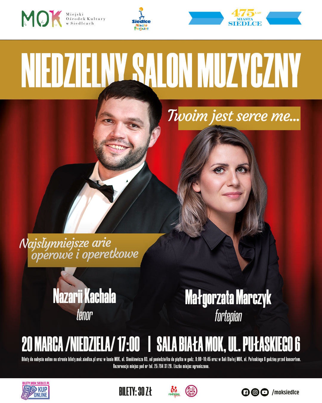 Bilety w cenie 30 zł do nabycia online na bilety.mok.siedlce.pl i w kasie MOK, ul. Sienkiewicza 63, od poniedziałku do piątku w godz. 9:00-16:45 oraz godzinę przed koncertem w Sali Białej. Rezerwacje miejsc pod nr tel. 25 794 31 26. Liczba miejsc ograniczona.