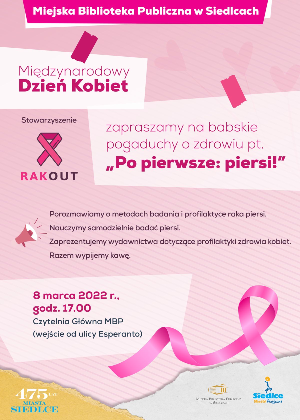Miejska Biblioteka Publiczna w Siedlcach z okazji Międzynarodowego Dnia Kobiet zaprasza na babskie pogaduchy o zdrowiu pt. „Po pierwsze piersi!” z udziałem założycielek i członkiń Stowarzyszenia RakOut.