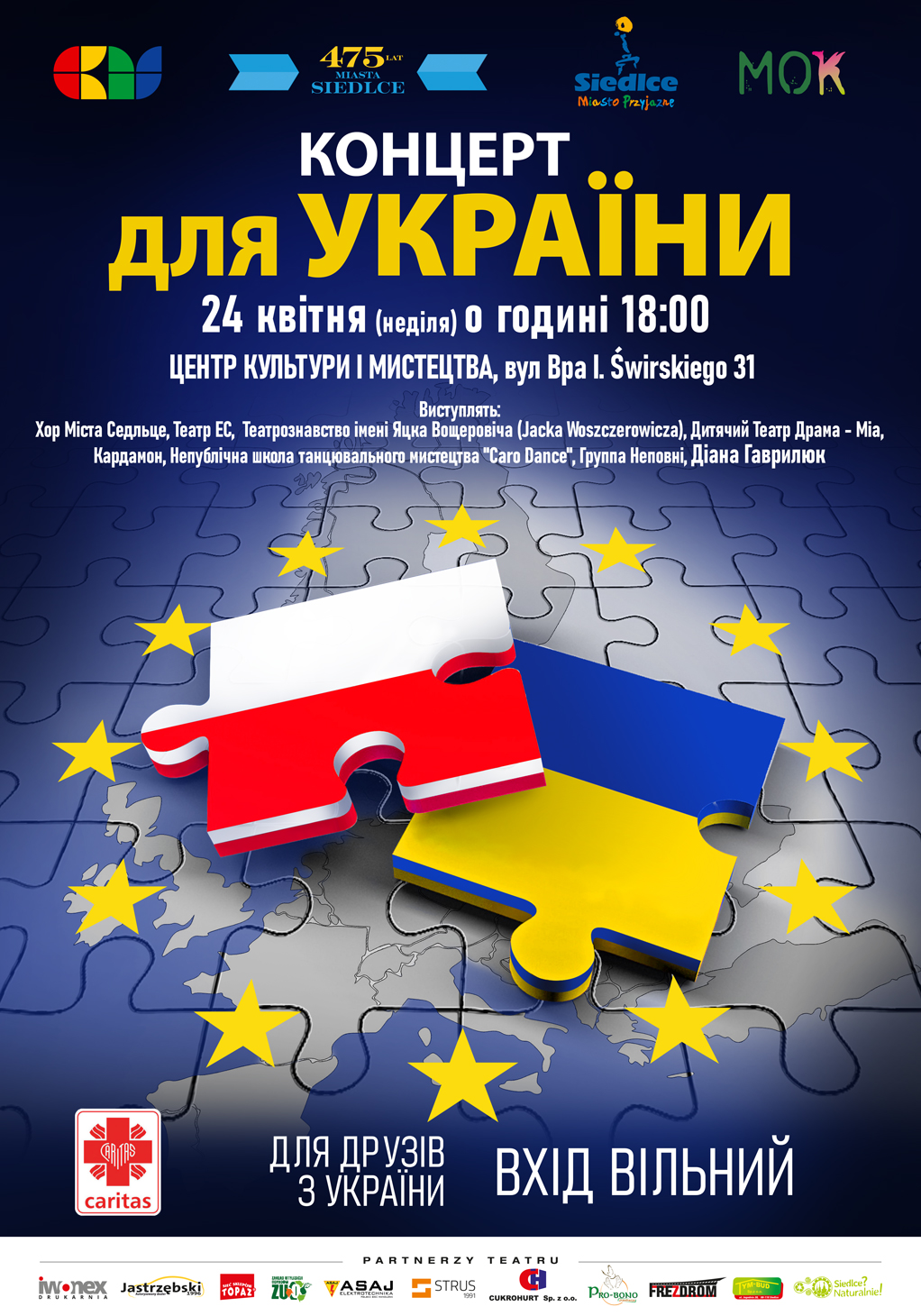 Na Scenie Teatralnej Miasta Siedlce wystąpią artyści Centrum Kultury i Sztuki oraz zaproszeni goście. Koncert rozpocznie Chór Miasta Siedlce uroczystym wykonaniem narodowego hymnu Polski i Ukrainy oraz Poloneza Ogińskiego. W dalszej części widowiska w różnorodnym repertuarze zaprezentują się m.in. Teatr ES, Studio Teatralne im. J. Woszczerowicza, Teatr Dziecięcy Dramma-Mia, Kardamon, Zespół Niekompletni z Miejskiego Ośrodka Kultury w Siedlcach, tancerze Niepublicznej Szkoły Sztuki Tańca Caro Dance oraz Diana Havryliuk. Podczas koncertu prowadzona będzie zbiórka pieniężna, która w całości przekazana zostanie na rzecz pomocy uchodźcom z Ukrainy oraz miasta partnerskiego Siedlec, Berdyczowa.