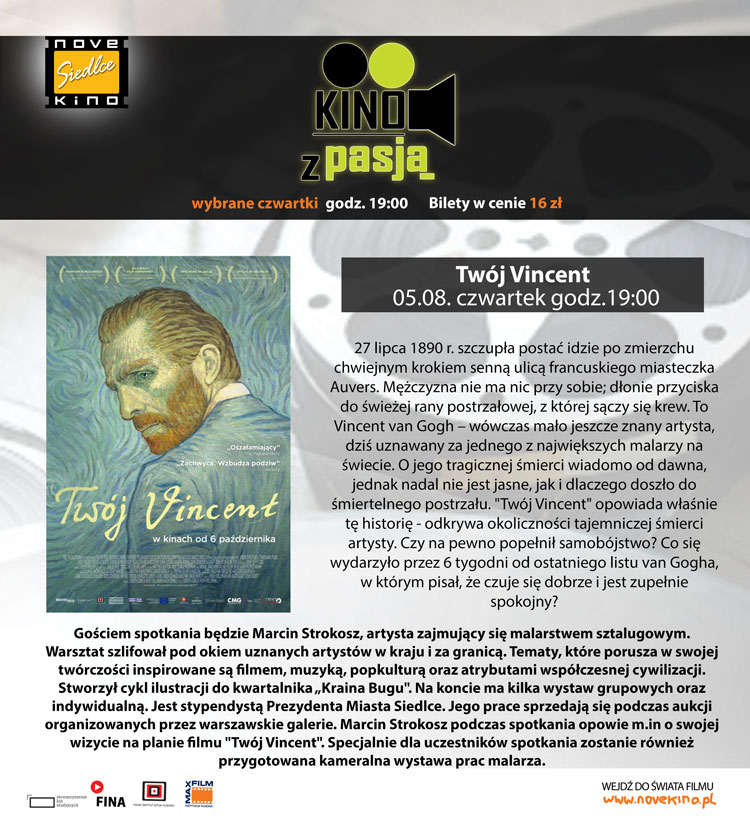 Czwartkowy seans poprzedzi spotkanie z Marcin Strokoszem, artystą zajmujący się malarstwem sztalugowym, który swój warsztat szlifował pod okiem uznanych malarzy w kraju i za granicą. Tematy, które Marcin Strokosz porusza w twórczości, inspirowane są filmem, muzyką, popkulturą oraz atrybutami współczesnej cywilizacji. Na swoim koncie ma kilka wystaw grupowych oraz indywidualną. Jego prace sprzedają się podczas aukcji organizowanych przez warszawskie galerie. Marcin Strokosz podczas rozmowy, którą poprowadzi Agnieszka Osmólska-Ilczuk, opowie m.in o swojej wizycie na planie filmu "Twój Vincent", a specjalnie dla uczestników spotkania zostanie także przygotowana kameralna wystawa prac malarza.