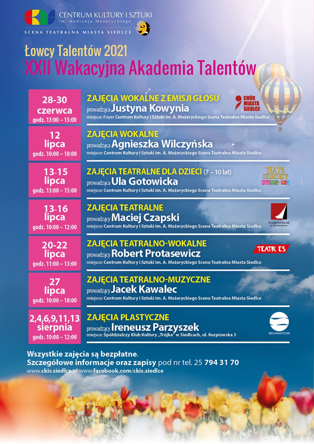 Udział we wszystkich zajęciach w ramach Wakacyjnej Akademii Talentów jest bezpłatny. Szczegółowy program poniżej: